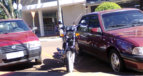 “Moto estacionada em meio aos carros porque em Campo Mourão nao existe estacionamento para motocicletas”.