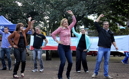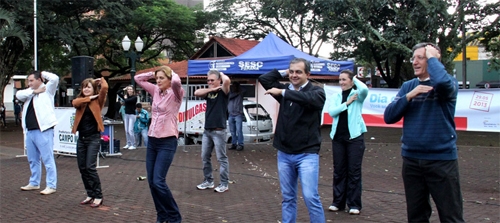 O clic é desta quarta-feira, na praça São José, onde aconteceu a abertura da programação do Dia do Desafio em Campo Mourão. A prefeita Regina Dubay participou, com direito a exercícios e até danças. Essa aí lembrou os tempos da Skate Discotheque, não lembrou? E dê-lhe John Travolta!...