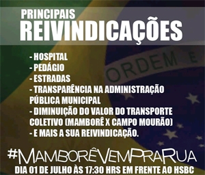 Ficou para segunda-feira (17h30) o primeiro protesto em Mamborê depois de iniciada a onda de manifestações pelo País.