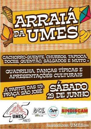 Acontece neste sábado (17h), na praça São José, o Arraiá da Umes. Como toda festa junina, haverá quadrilha, danças típicas e apresentações culturais. A realização é da Umes, com apoio do DCE da UTFPR, APP Sindicato e Sindiscam. E como este sábado é Dia de São Pedro, não vai chover, vai?...