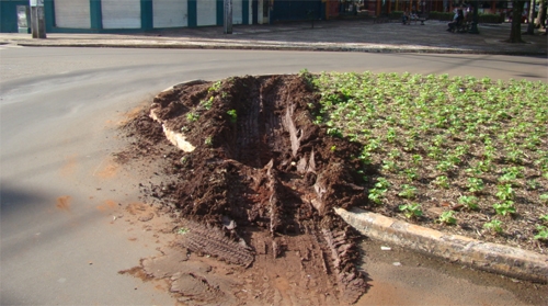 Coisas de Campo Mourão. Um caminhão passou por cima da “rotatória” da av. Capitão Índio Bandeira, na esquina com a rua Brasil. Passsou, destruiu tudo e encheu de barro o centro da cidade. Tem que dar parabéns pra esse motorista. Foi de caminhão onde não deveria ter ido e ainda tentou fazer uma conversão que não conseguiu. Que “motorista profissional”, hein?...