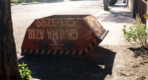 “Na rua Rocha Pombo, faz mais de um mês que essa caçamba de entulho está desse jeito, de cabeça para baixo e sem fundo”. Maurício