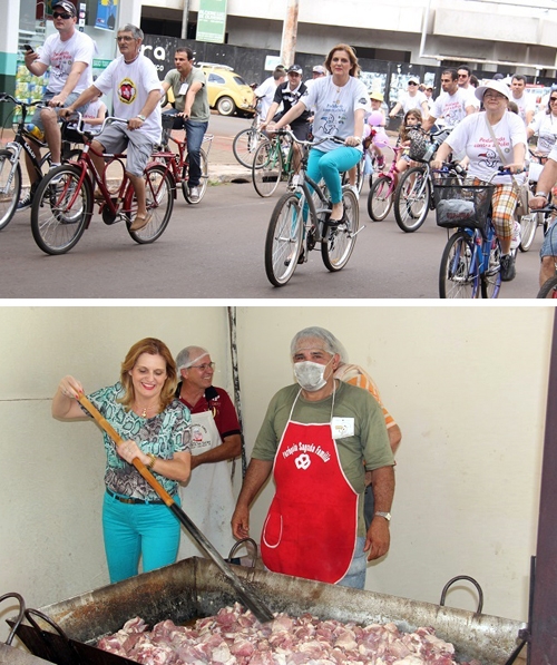 Os cliques são deste domingo, quando a prefeita Regina Dubay participou da "Pedalada contra a Pólio" promovida pelo Rotary e, depois, foi ao conjunto Cohapar, onde a comunidade preparou mais uma Festa do Porco no Tacho. Olha aí, exercício para as pernas num evento e para os braços no outro. Ah, quem é que precisa de academia...