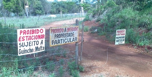 “Via pública interrompida irregularmente. Local: área de chácaras da usina - Parque Estadual Lagoa Azul. Não sei quem são os responsáveis, mas a prefeitura precisa tomar providências, visando a desobstrução. Os lotes são particulares, a estrada (rua) é publica e não pode ser impedido o trânsito. Já imaginaram fazer isto aqui na cidade?” Edson Battilani (Vereador)