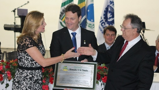 O presidente da Acicam, Marcelo Chiroli, recebeu a homenagem das mãos do vereador Edson Battilani e da prefeita Regina Dubay.