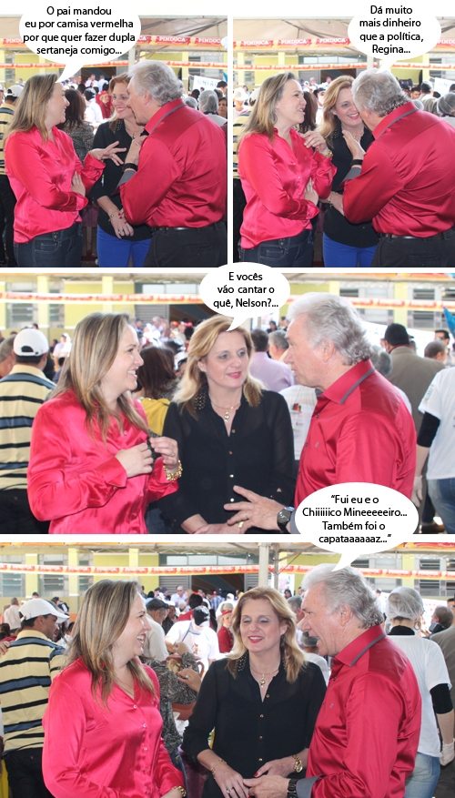 A deputada Marla Tureck e o ex-prefeito-pai Nelson Tureck pareciam dupla sertaneja neste domingo na Festa do Carneiro ao Vinho, em Peabiru. Os dois apareceram de camisas vermelhonas por lá. Como o prefeito anfitrião Claudinei Minchio é “petista da gema” já se sentiu homenageado e foi pro clic. Portanto, são dois de camisa vermelha e outro já vermelho “por natureza”...