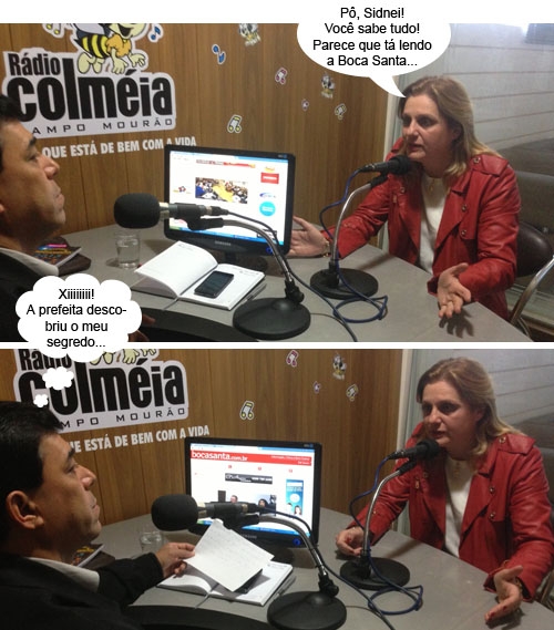 Os cliques são desta quarta-feira, na rádio Colmeia, durante o programa apresentado pelo vereador Sidnei Jardim. A prefeita Regina Dubay foi uma das entrevistadas. Ela falou principalmente sobre o decreto de situação de emergência na saúde. E repare que Jardim apresenta ligadinho na Boca Santa. Ô vereador esperto, sô!...