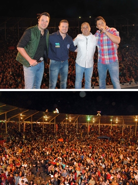 O show com a dupla João Bosco & Vinícius marcou o encerramento, nesta segunda-feira, da Expogoio, em Goioerê. O povão superlotou o Parque de Exposições. O prefeito Beto Costa, é claro, foi lá fazer uma tietagem. Segundo ele, o show com portões abertos foi um presente aos goioerenses pelos 58 anos município, completados no sábado. Detalhe: A Expogoio é realizada pela Sociedade Rural, que é dona do Parque de Exposições. A prefeitura entra com apoio, como o show principal, por exemplo.