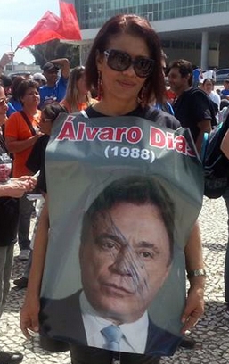 O que é isso? A vereadora Professora Vilma fazendo propaganda para o senador Álvaro Dias? Pelo contrário. O cartaz foi feito para marcar dos 25 anos em que professores do Estado apanharam da polícia em frente ao Palácio Iguaçu, quando Álvaro era governador. A parte de trás do cartaz diz “Eu estava lá”. O fatídico 30 de agosto é lembrado todo ano pela APP-Sindicato. A Professora Vilma usou esse cartaz aí durante a manifestação desta semana, em Curitiba. No mais, a vereadora é petista e o senador é tucano, portanto, não dá liga mesmo...