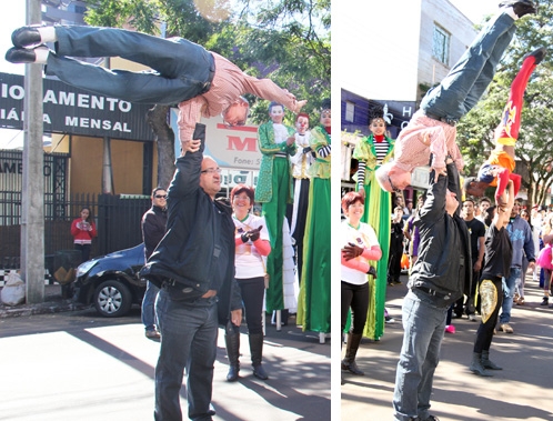 Uma passeata agitou Campo Mourão nesta quinta-feira. E não era protesto, não. Eram participantes do 6º Festival do Circo, que começou na terça-feira e segue até sábado. A dupla Leon Schlosser, 80, e Edson Silva, 49, roubou a cena. Eles fazem apresentação de duo de parada e já apareceram em rede nacional em vários programas de televisão. Os dois apresentam nesta sexta-feira (20h), no Teatro Municipal, o espetáculo “O Tempo”. E cá pra nós: melhor ver isso no teatro que tentar fazer em casa, hein?...