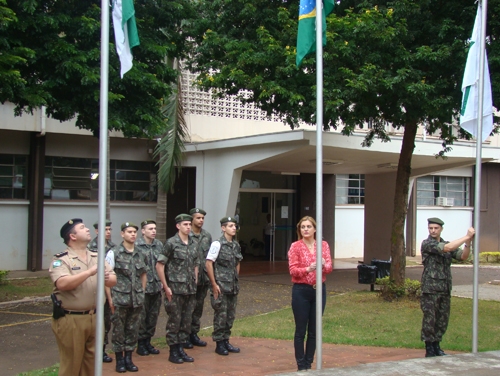 A prefeita Regina Dubay, o major Wanderley Castro (11º BPM) e o subtenente Leandro Scapim (Tiro de Guerra) hastearam as bandeiras e discursaram.