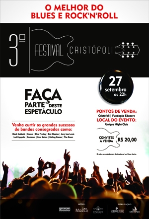 Já estão à venda os convites para o 3º Festival Cristófoli. O evento acontece no próximo dia 27, no Espaço Unique. Eles custam R$ 20 e podem ser comprados na Cristófoli e na Fundação Educere. A renda será revertida para o Lar Dona Jacira. O festival terá sucessos de bandas e cantores como Black Sabbath, Cream, Elvis Presley, Eric Clapton, Jerry Lee Lewis, Led Zeppelin, Ramones, Raul Seixas e The Doors, entre outros.