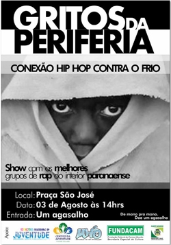 Bandas de rap e grupos de break de Campo Mourão e região se apresentam neste sábado, na praça São José no evento “Gritos da Periferia: Conexão Hip Hop contra o Frio”. A realização é do Centro da Juventude e do Movimento Hip Hop Organizado (MH2O) e a entrada é a doação de um agasalho.